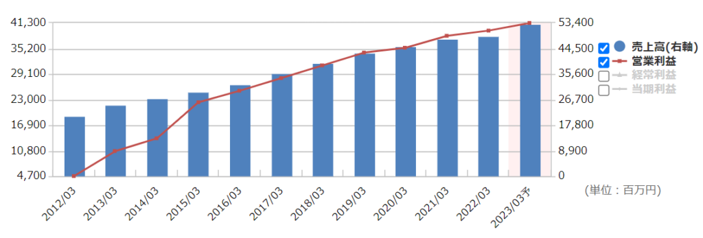 マネックス証券の銘柄スカウターを見ると、過去10年にわたり順調に売上を伸ばしていることがわかります。本業からのもうけである営業利益も、企業の最終的なもうけである当期純利益も10年間を通じて毎年20%成長という、かなり高い成長率をほこっています。そして営業利益率は80%近くあり、圧倒的な高利益率!財務体質も健全(有利子負債比率=16.2%、ネットD/Eレシオ=-75.2%。実質無借金)で、優良企業と言えそうです。