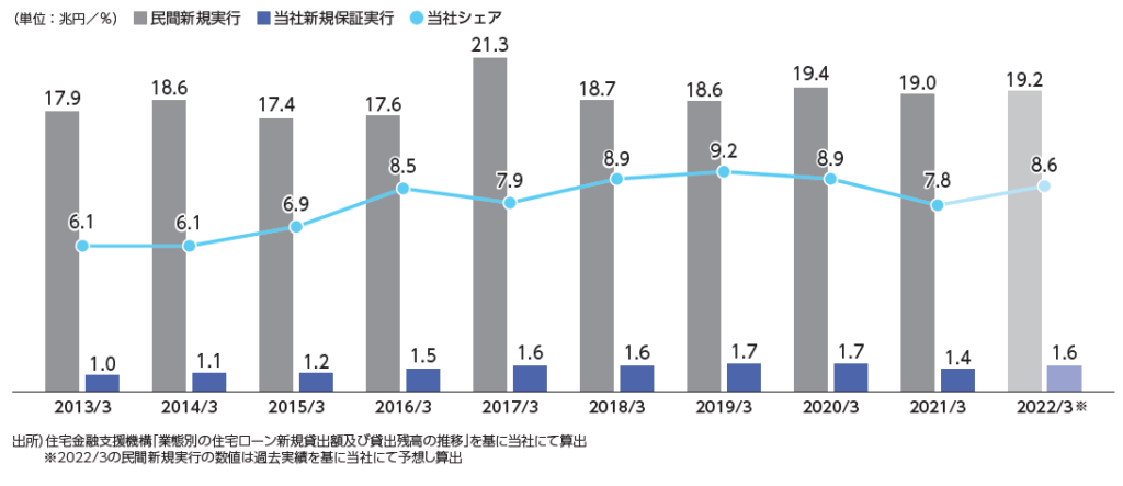 全国保証は、住宅ローン保証業務では業界1位のシェアのようですが、シェアは8.6%程度。シェアの拡大余地はかなり大きいですね。しかも民間住宅ローンの新規貸出額は年間19兆円。巨大な市場です。