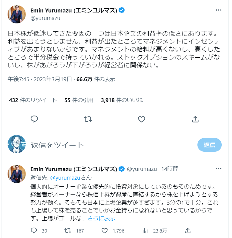 日本企業の利益率の低さは、ストックオプション等が導入されておらずマネジメントの給料が高くないことが原因だ、と指摘するエミンユルマズ氏のツイートがバズっていました。